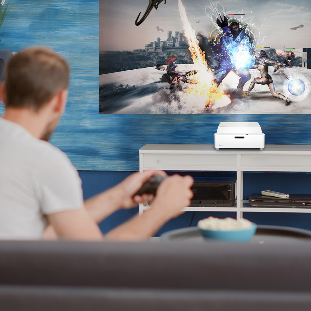 Whether you're playing on PC or next-gen consoles, Optoma's gaming projectors let you experience oversized, crisp visuals and razor-sharp responsiveness for seamless, low-latency gameplay across every resolution and refresh rate.