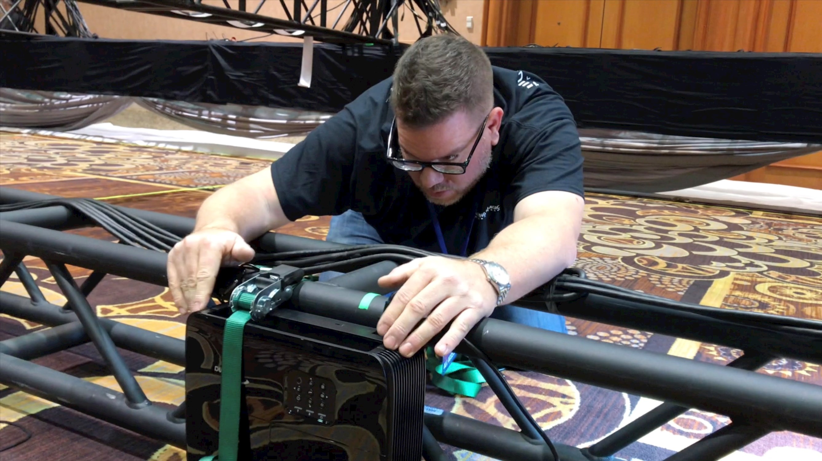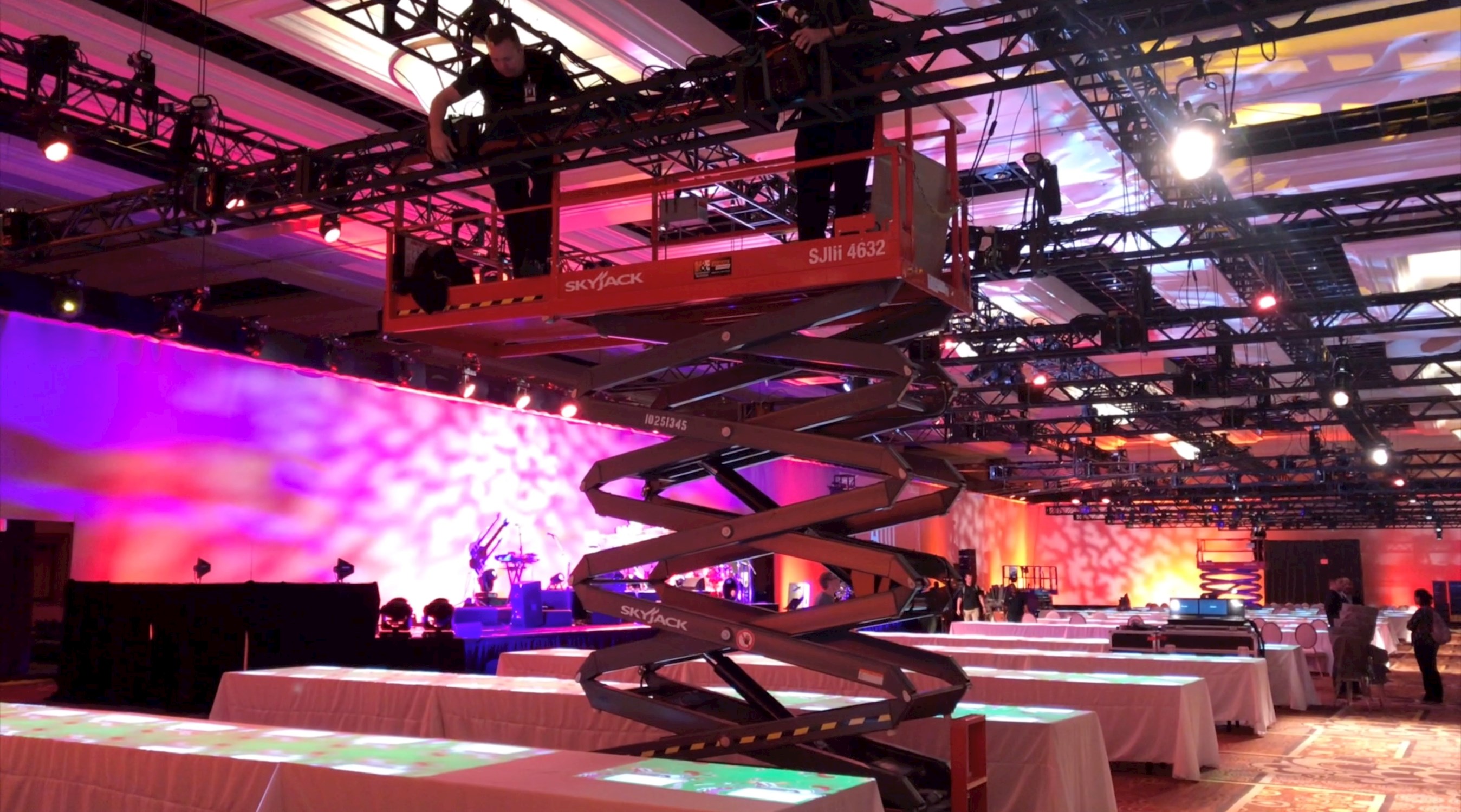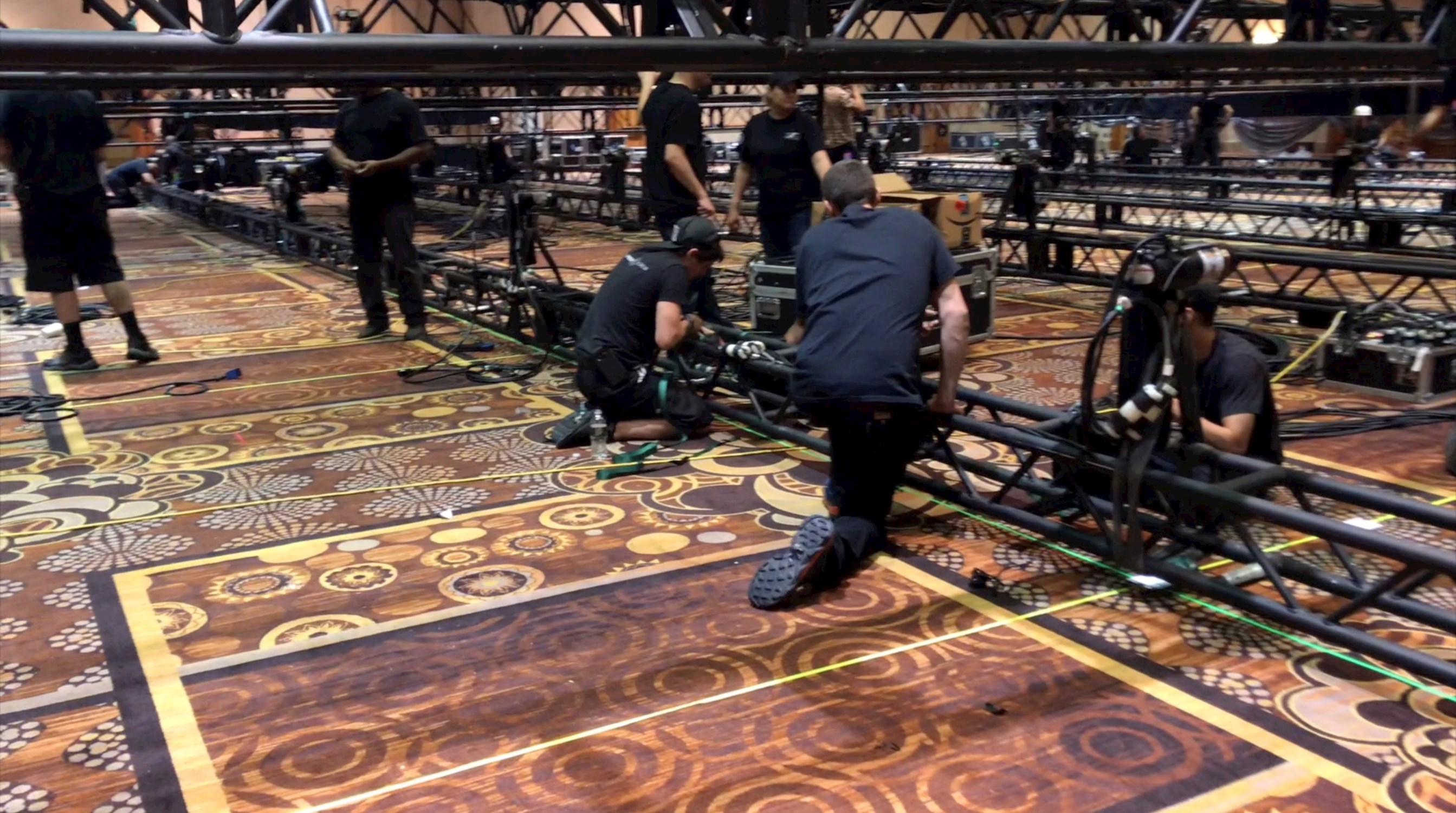 With only 38 hours in the venue space to set up before the start of the event, the team had to install 220 projector units to execute the grand spectacle. First, the team devised a floor plan and power grid system to determine an appropriate and safe layout for the projectors. Once the floor plan was developed, the team determined that the installation required nearly 7,000 feet of HDMI cables, 5,800 feet of power cables and 1,300 feet of projection surface.