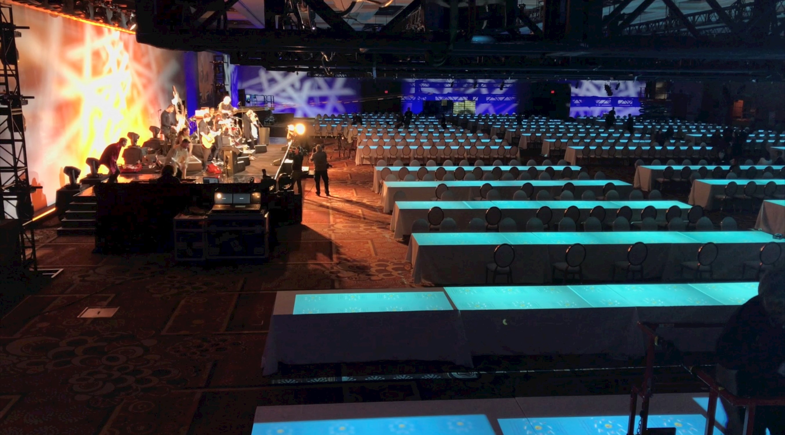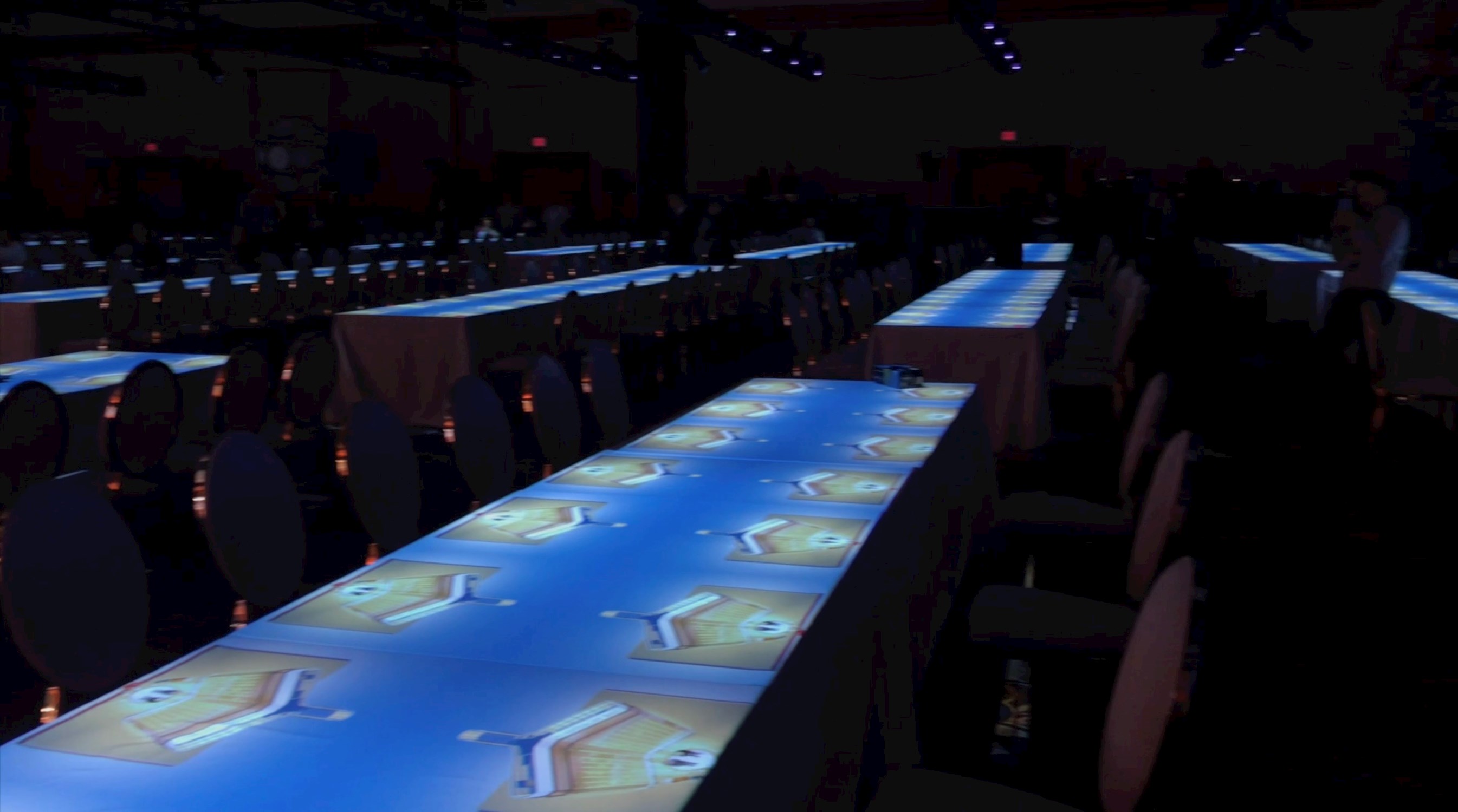 The team worked tirelessly throughout the night, overcoming unexpected glitches, color matching the projectors to ensure the animations ran consistently across every unit, and carefully setting up the thousands of feet of cables to power the projectors and run the table animation program.