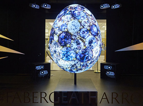 Stuart Henry, international window designer, conceived the idea of a virtual egg for Faberge’s Easter window. Stuart and his team at creative agency, JUSTSO, visualised an interactive projection show on a 1.5 metre 3D egg-shaped model, and commissioned Projection Artworks to produce the digital content and projection element.