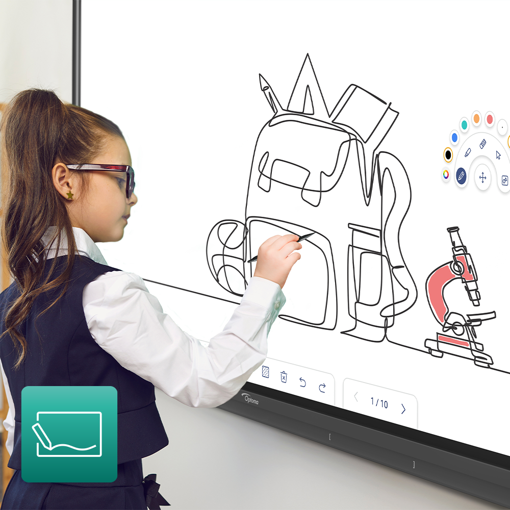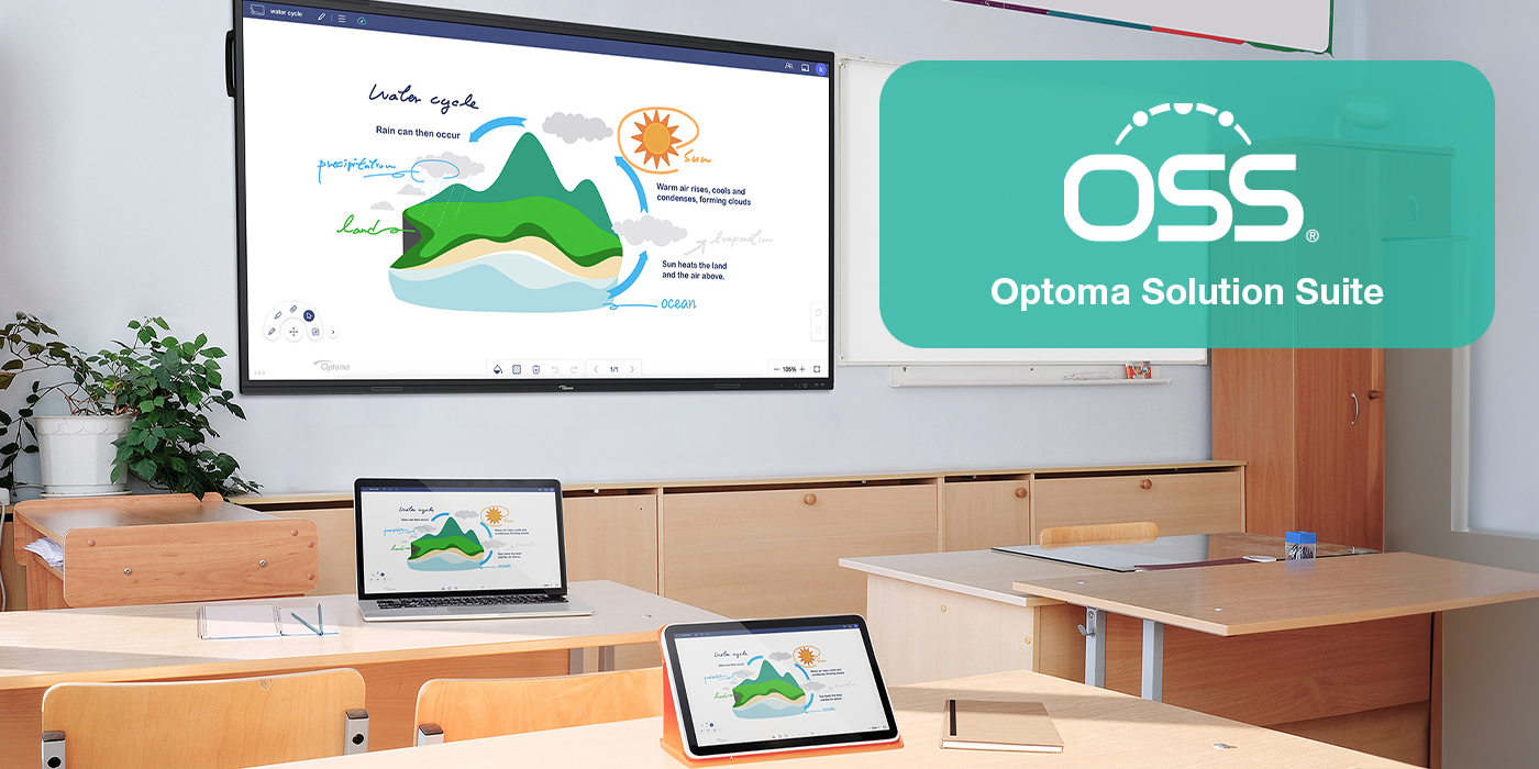- **Optoma Solutions Ecosystem:** Includes Optoma Solution Suite, Optoma Account Manager, and the Optoma Management Suite for streamlined operations. Experience the intuitive collaborative Whiteboard with AI-enabled tools, wireless sharing with remote control, laser pointer, and easily sync your favorite cloud storage.