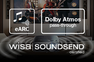 eARC (Audio Return Channel) with Dolby Atmos passthrough creates immersive, object based multi-dimensional sound. With WiSA certification, enjoy wireless, high-fidelity sound and seamless connection to WiSA-compatible speakers.