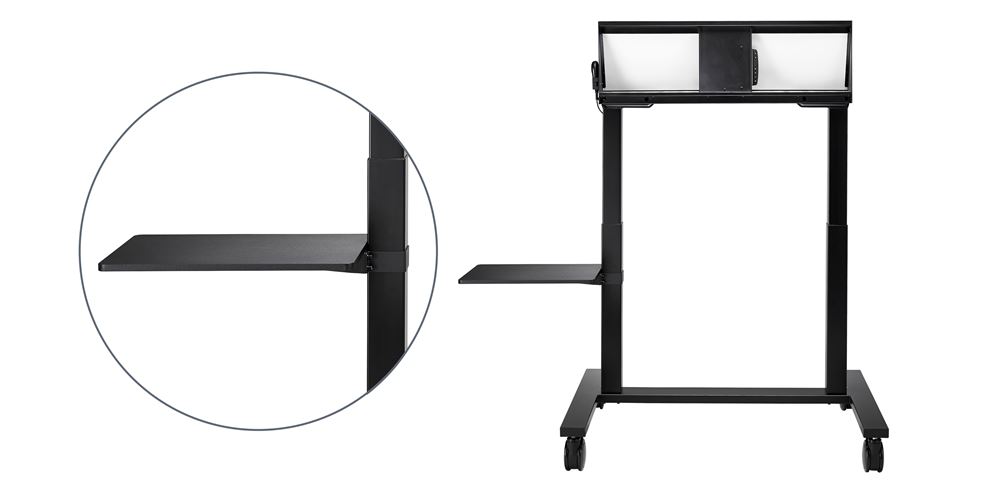 The TB01 shelf provides a convenient storage surface for laptops and is easily height adjustable. It clamps to the uprights of the EST09 motorized cart and has a maximum load of 22 lbs.