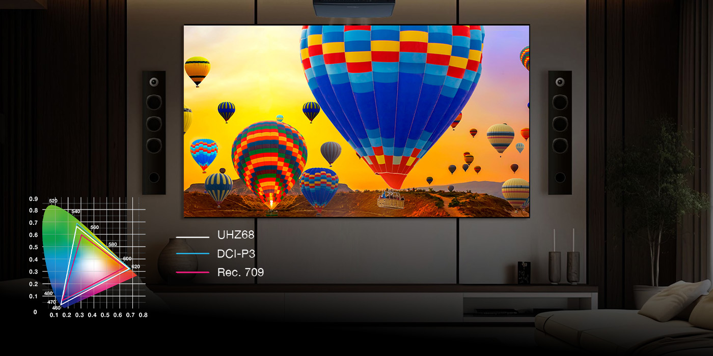 Delivering 100% Rec.709 and featuring a wide color gamut mode with 90%+ DCI-P3 coverage, this projector ensures accurate and lifelike colors. Whether you're watching movies or playing games, the UHZ68 brings brilliant hues and deeper blacks to your projected image. Colors appear vibrant and accurate, matching theatrical reference standards. From subtle skin tones to explosive visual effects, every scene displays stunning realism and precision with deeper blacks, vibrant hues, stunning contrast without rainbow effects.