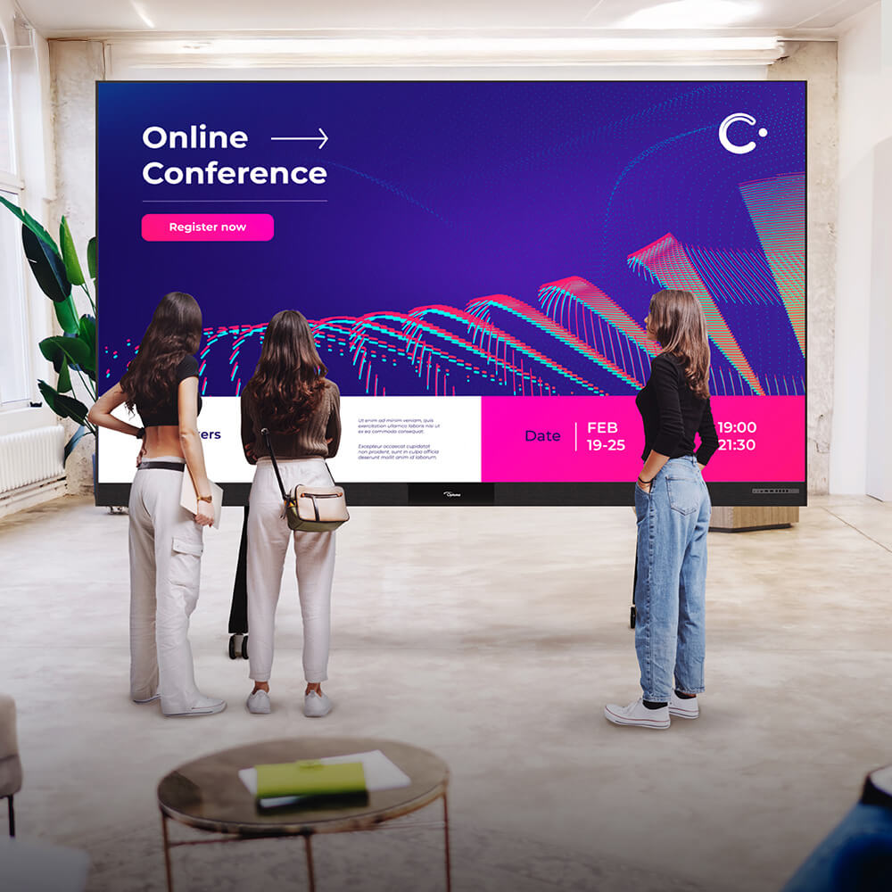 Schedule videos, images, and text across displays with flexible split-screen layouts.