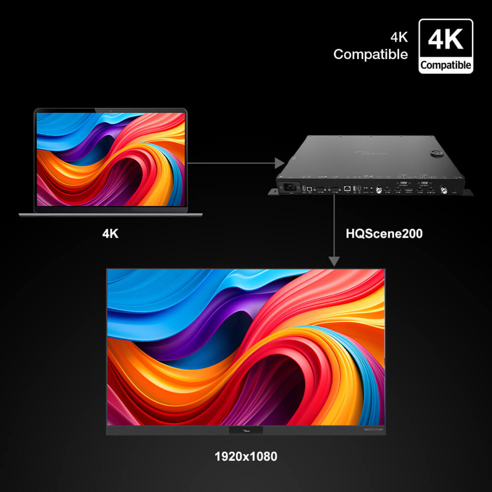 HQScene200 seamlessly handles 4K input sources, processes the signal, and outputs stunning 1080p visuals on FHDC135, ensuring high-quality display across diverse applications.