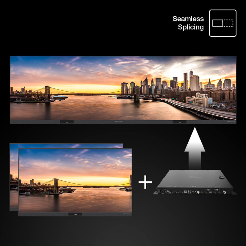 Transform your space with splicing technology. Using dual side-by-side displays one can scale one ultra-wide content across both screens or show separate content sources as if they are showing on one display; creating a seamless, captivating experience that inspires creativity and teamwork.